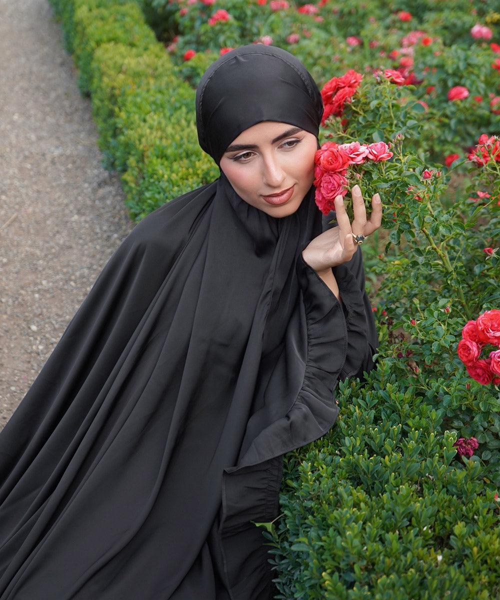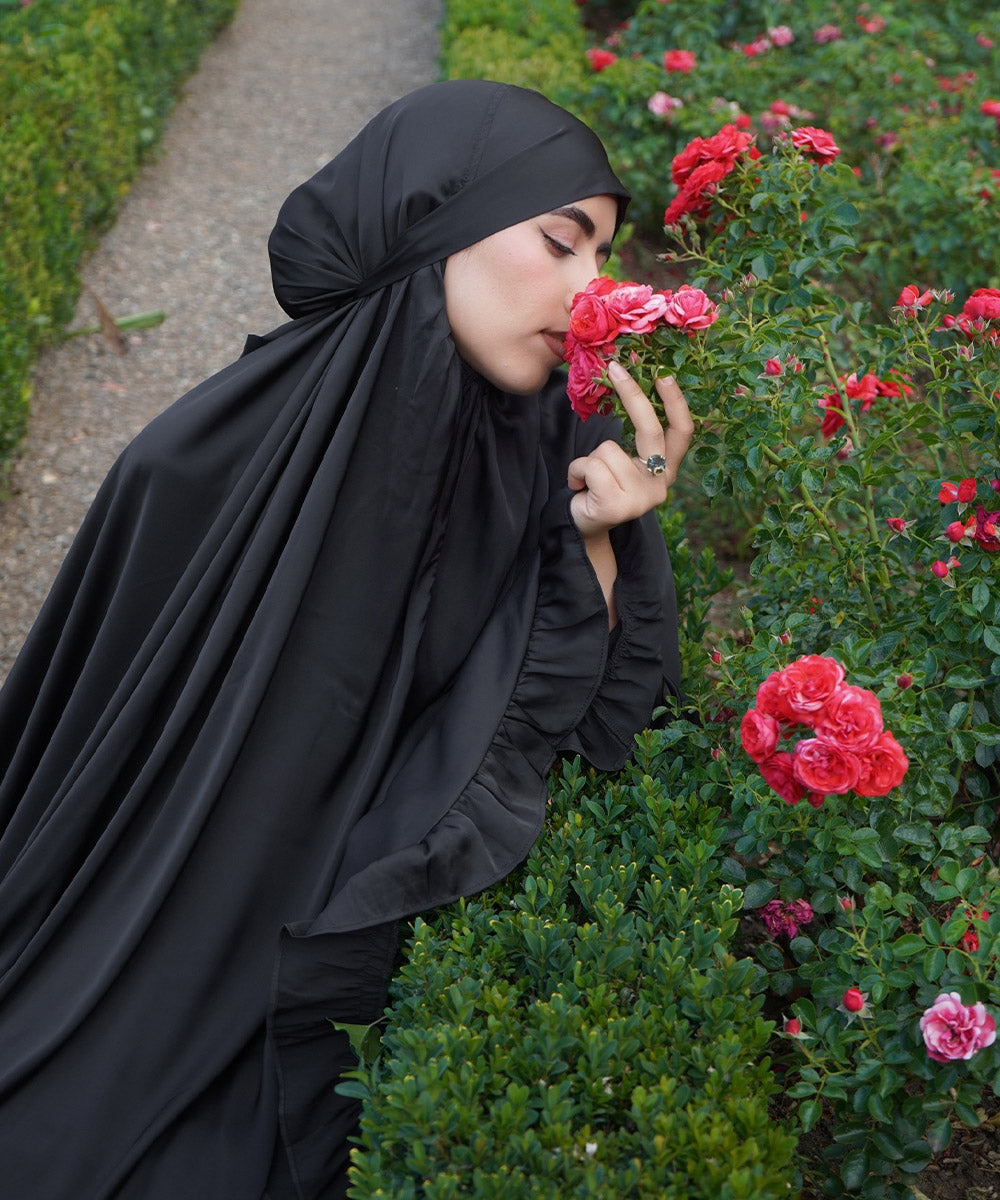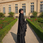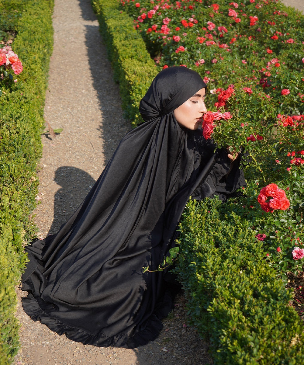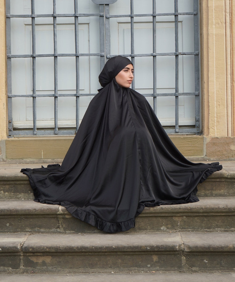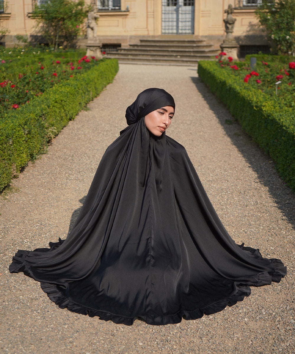 Der Khimar umhüllt Kopf, Schultern und Oberkörper und bietet dabei optimalen Komfort. Der lange Rock verfügt über einen elastischen Bund, der für eine flexible Passform sorgt. Zusätzlich kann die Länge des Rocks durch Hochziehen individuell angepasst werden – perfekt für verschiedene Bedürfnisse. Die feinen Rüschen am Saum verleihen dem Kleid eine dezente, stilvolle Note, ohne die Schlichtheit zu beeinträchtigen.