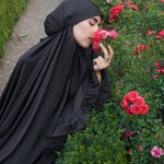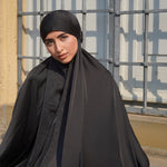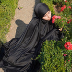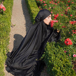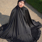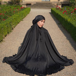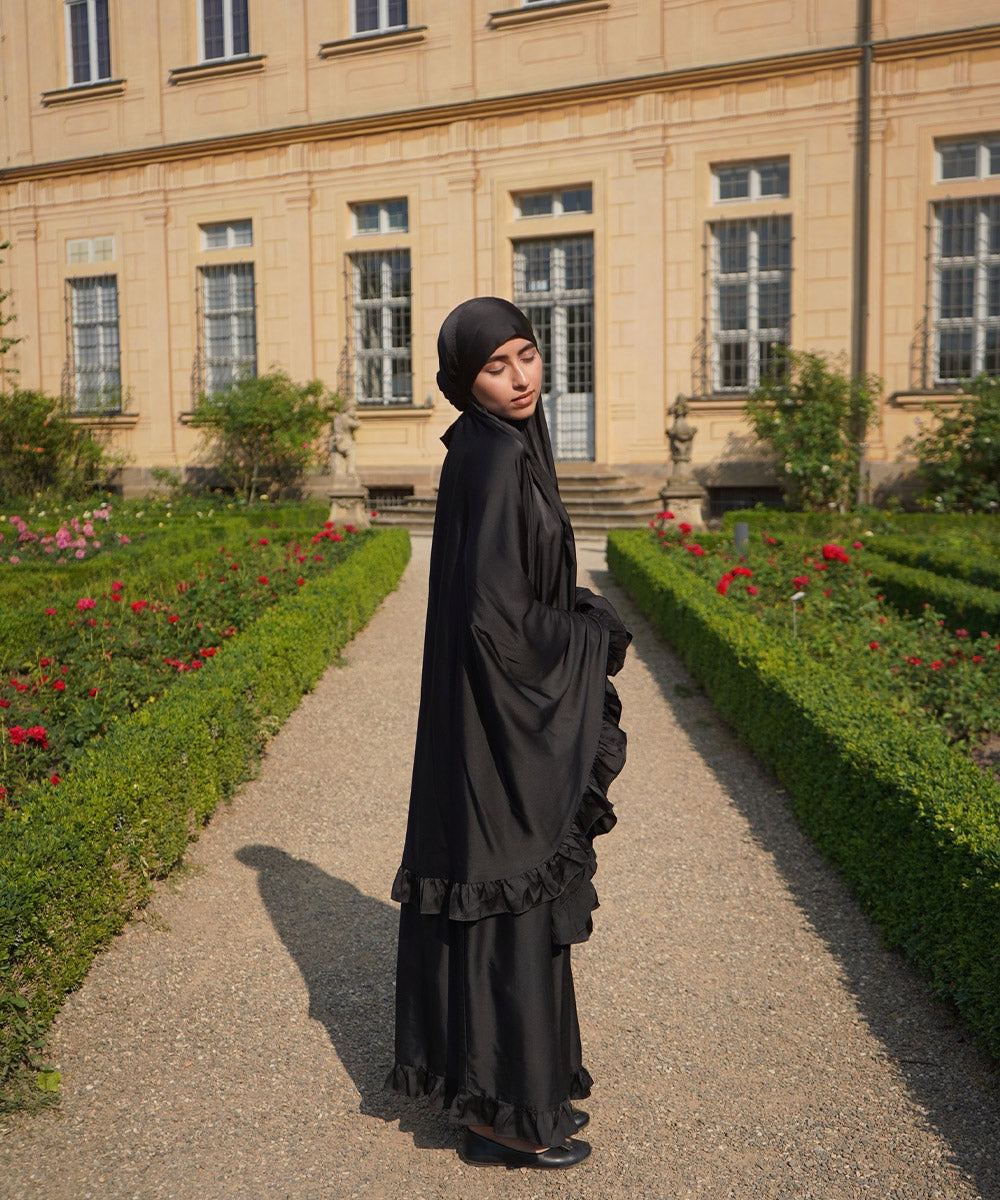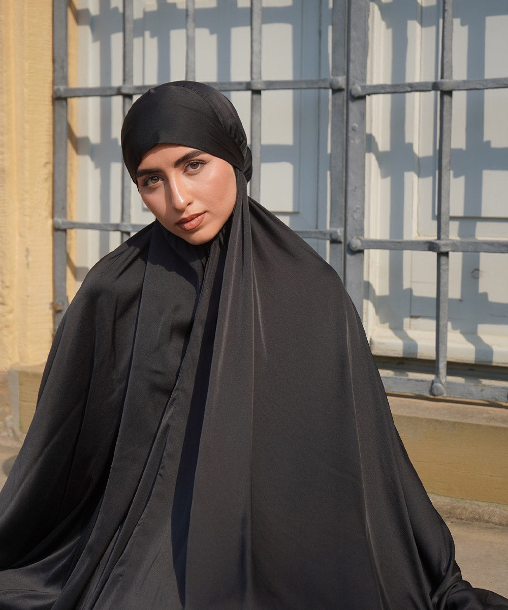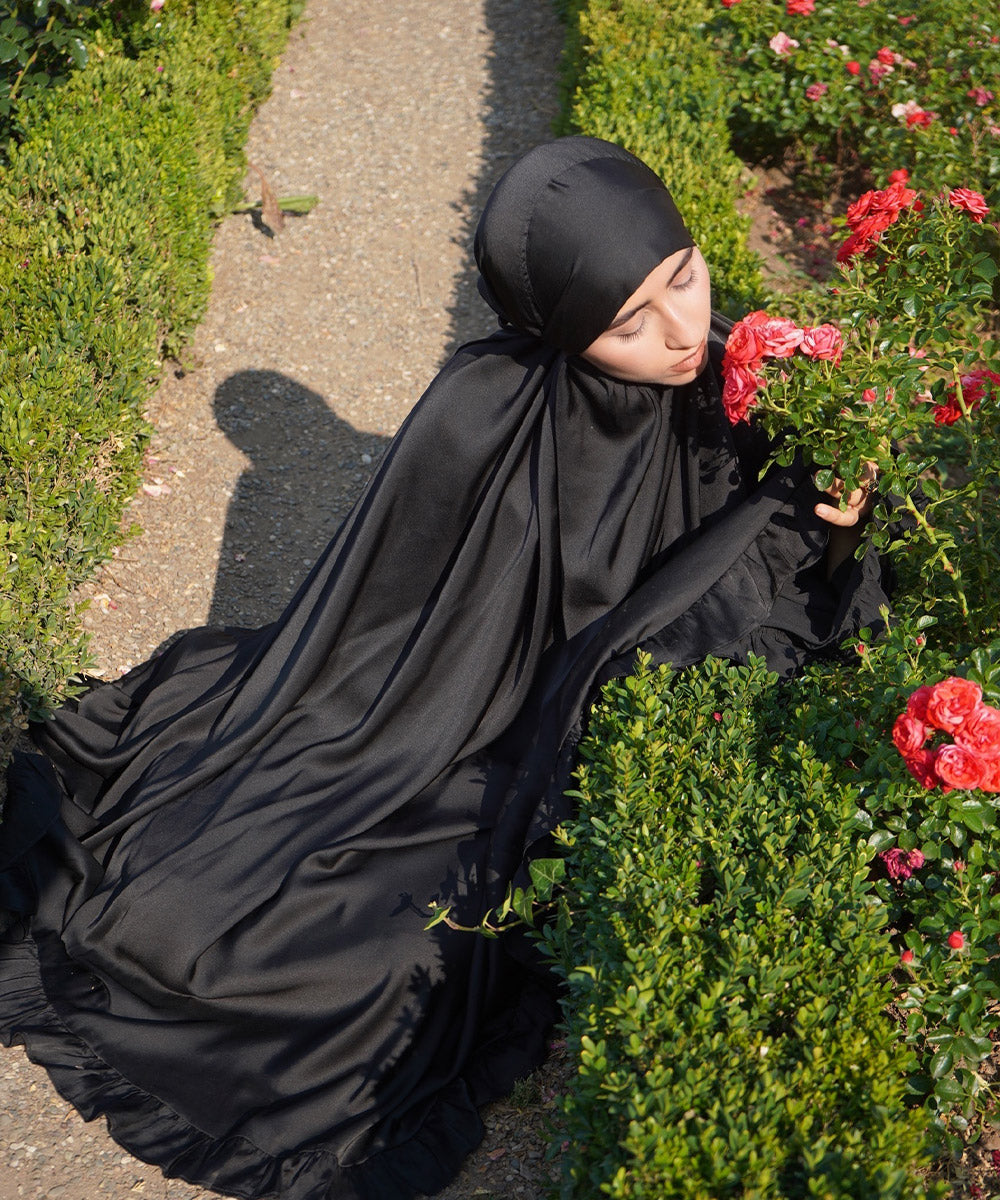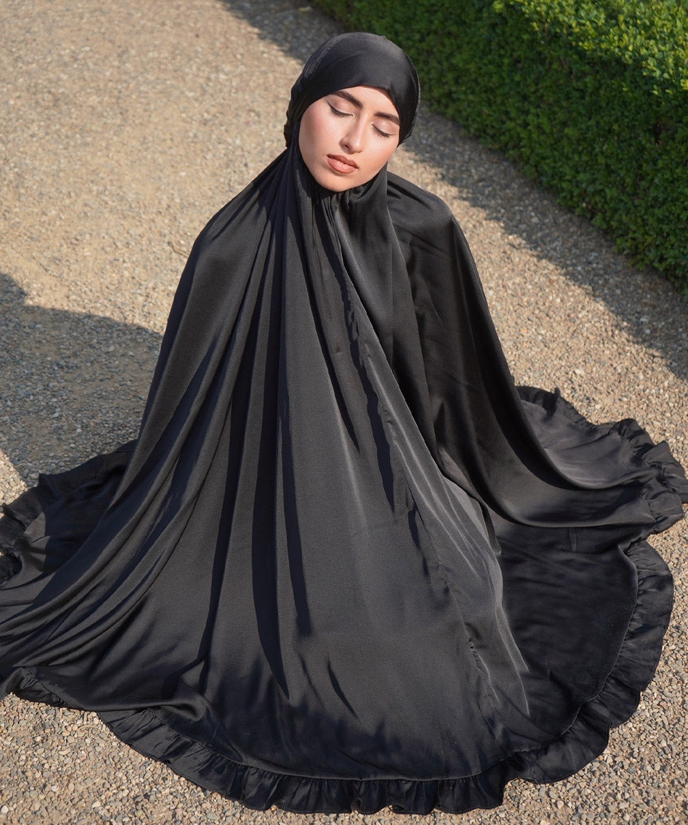Der Khimar umhüllt Kopf, Schultern und Oberkörper und bietet dabei optimalen Komfort. Der lange Rock verfügt über einen elastischen Bund, der für eine flexible Passform sorgt. Zusätzlich kann die Länge des Rocks durch Hochziehen individuell angepasst werden – perfekt für verschiedene Bedürfnisse. Die feinen Rüschen am Saum verleihen dem Kleid eine dezente, stilvolle Note, ohne die Schlichtheit zu beeinträchtigen.