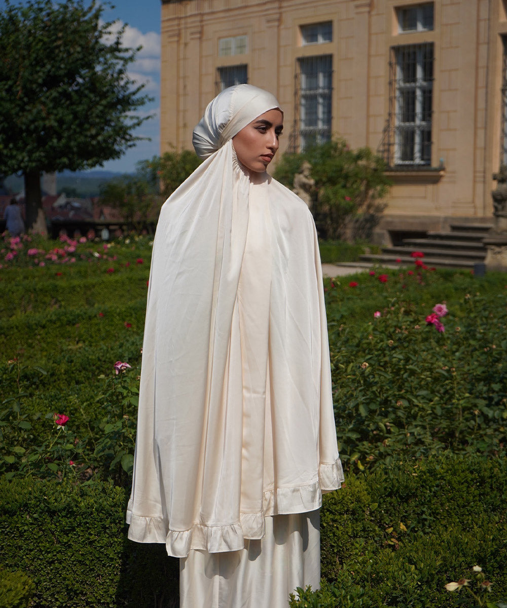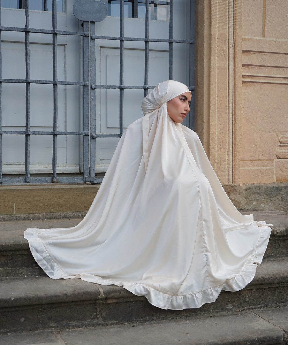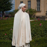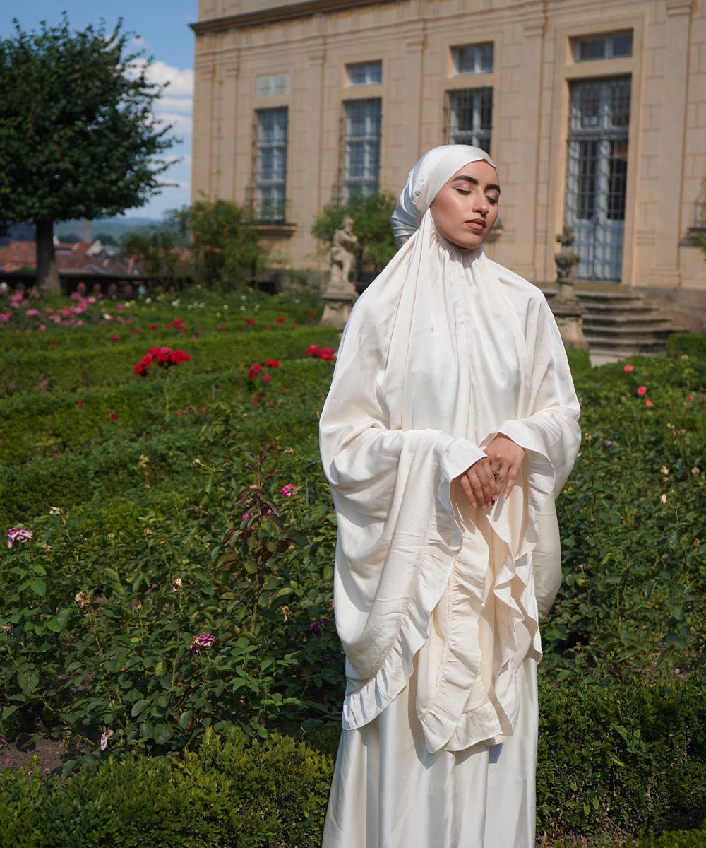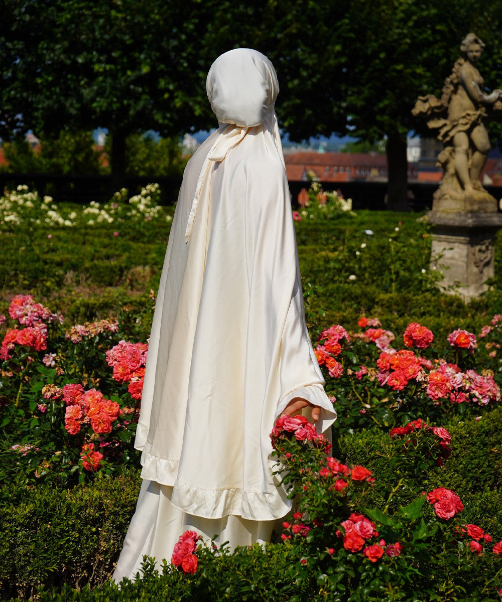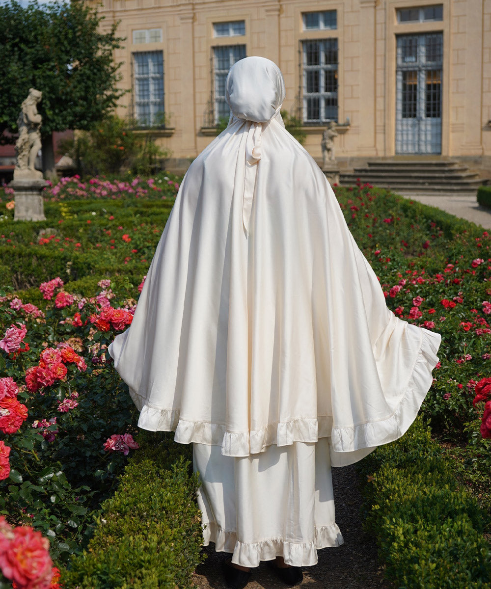 Dieses zweiteilige Gebetskleid vereint handgefertigte Präzision, höchste Qualität und islamische Eleganz. Der leichte, fließende Stoff sorgt für ein angenehmes Tragegefühl und vollständige Bedeckung, ideal für das Gebet.
