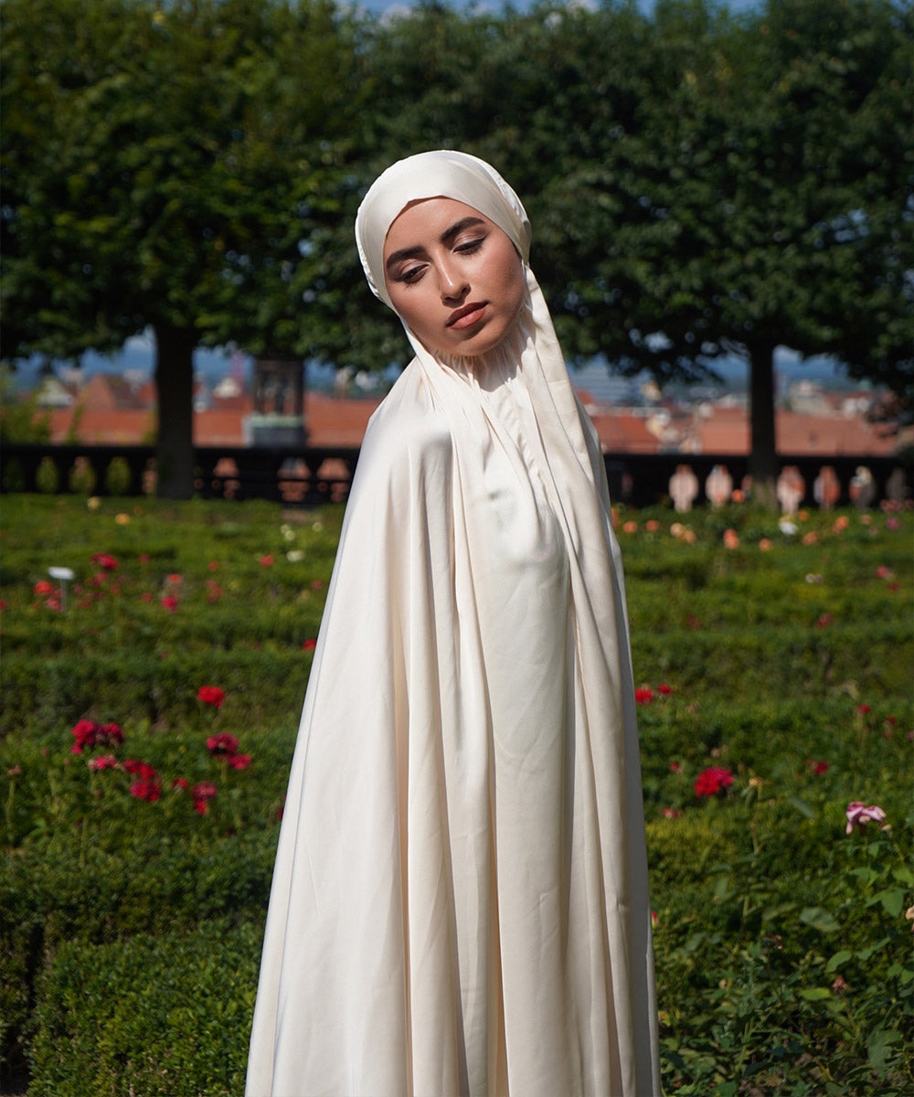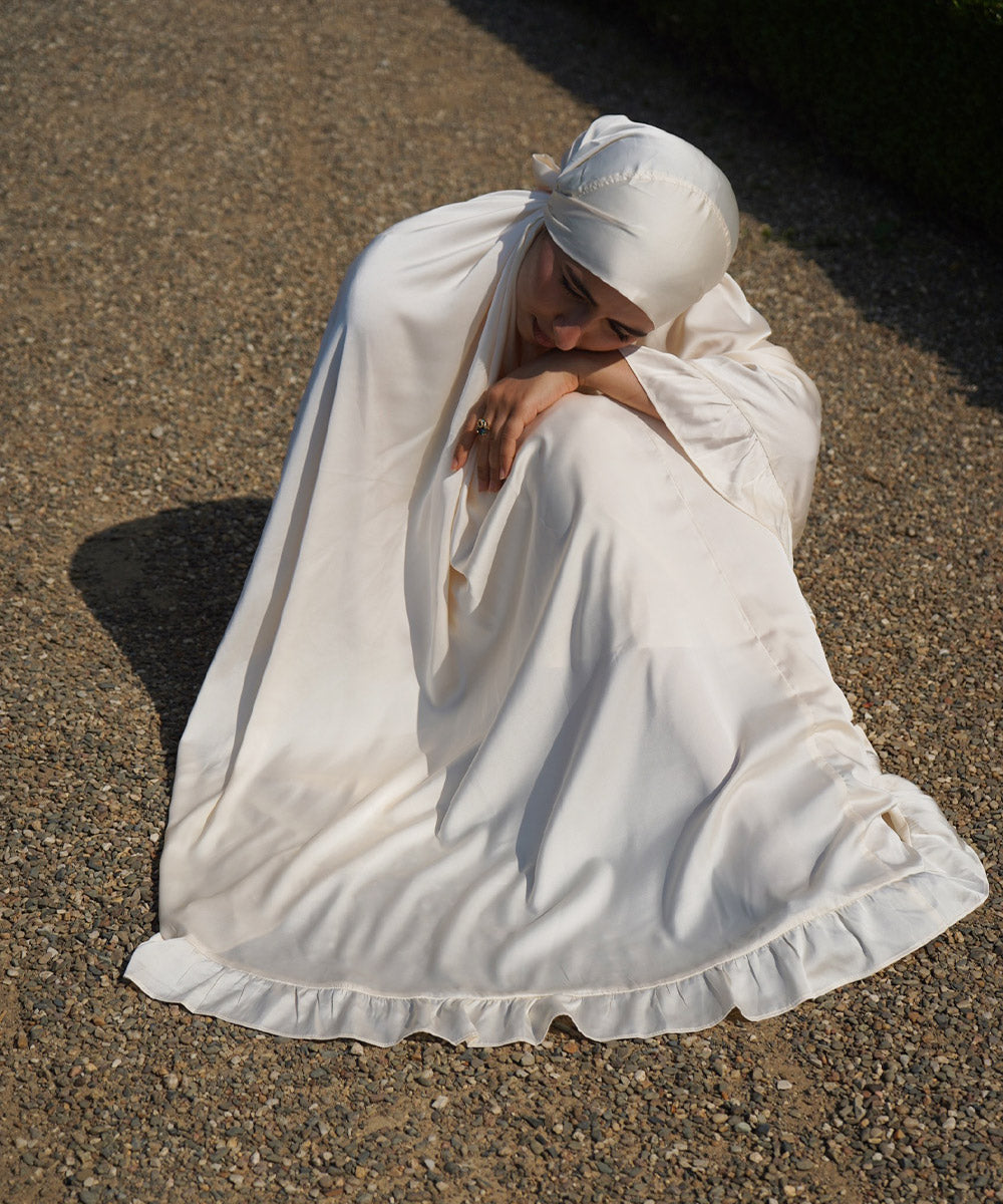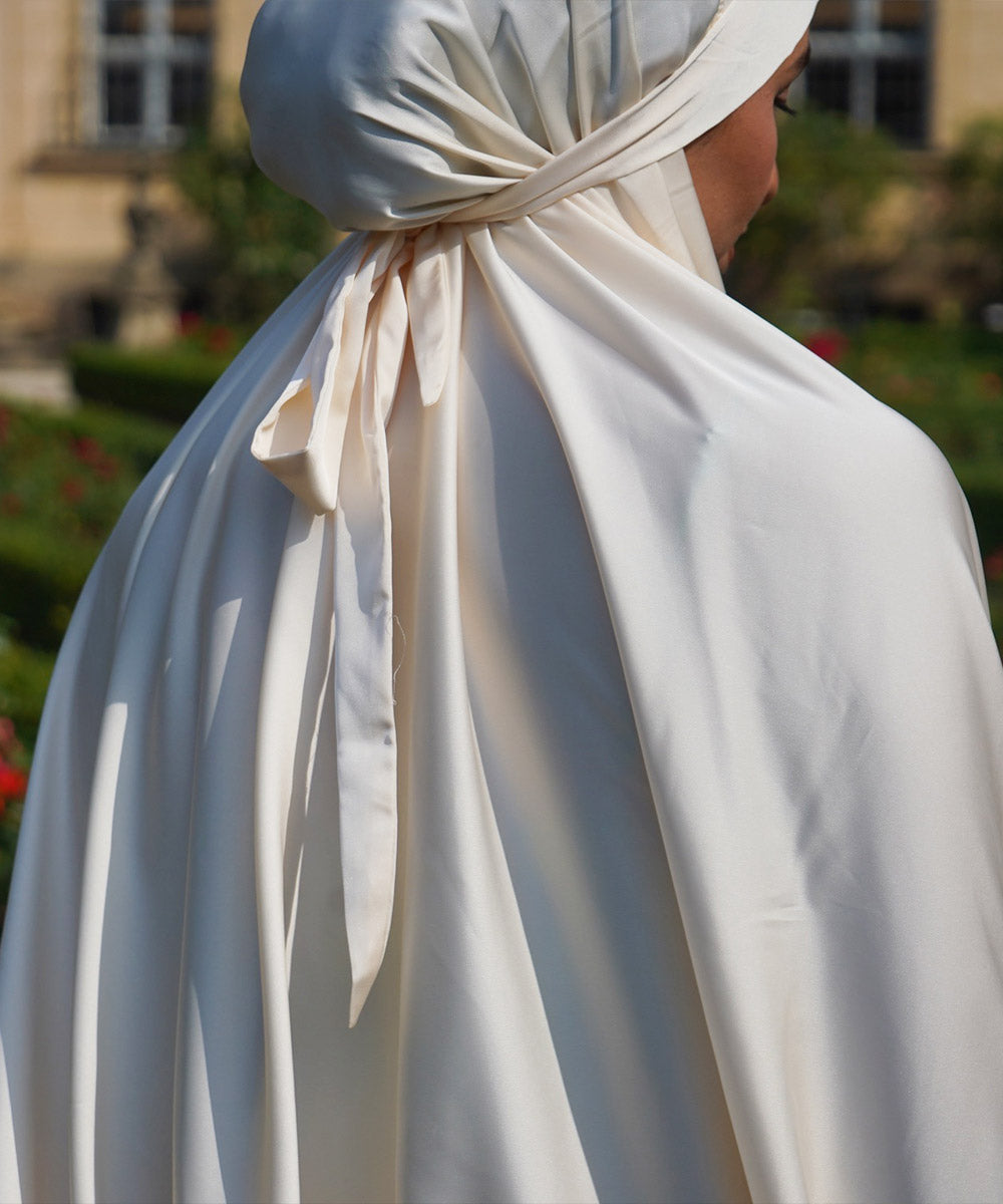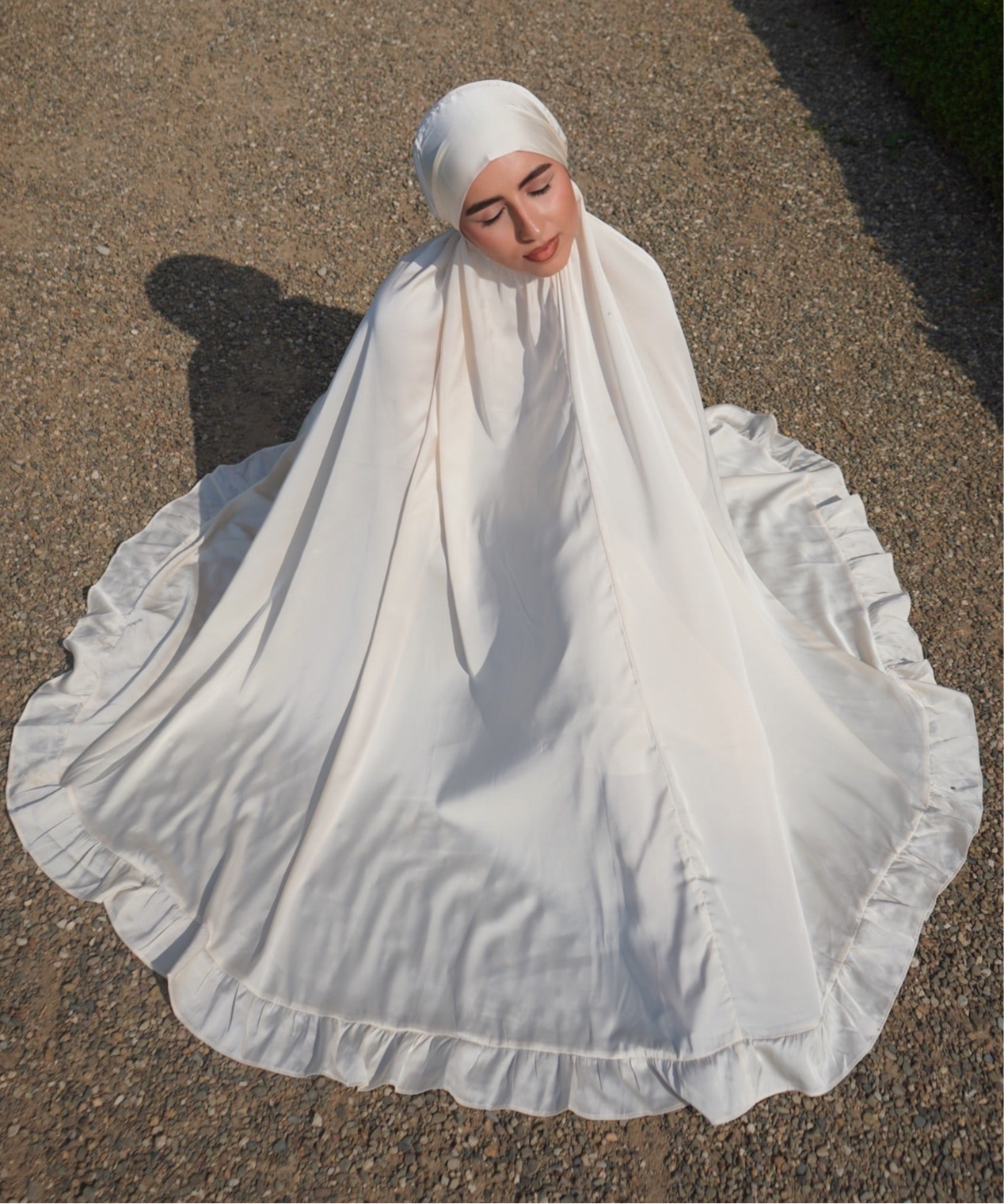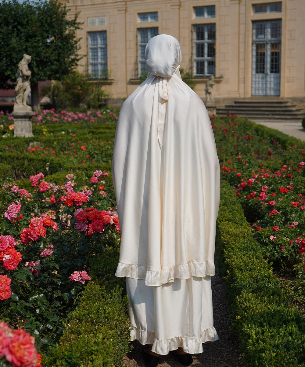 Dieses zweiteilige Gebetskleid vereint handgefertigte Präzision, höchste Qualität und islamische Eleganz. Der leichte, fließende Stoff sorgt für ein angenehmes Tragegefühl und vollständige Bedeckung, ideal für das Gebet.