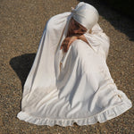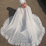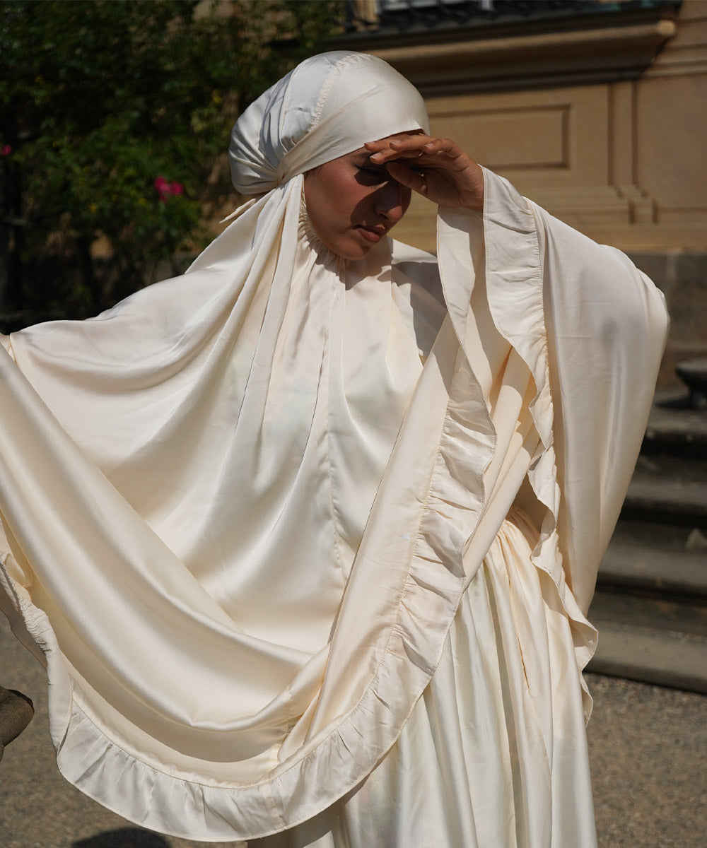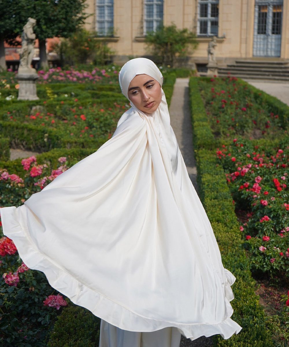 Der Khimar umhüllt Kopf, Schultern und Oberkörper und bietet dabei optimalen Komfort. Der lange Rock verfügt über einen elastischen Bund, der für eine flexible Passform sorgt. Zusätzlich kann die Länge des Rocks durch Hochziehen individuell angepasst werden – perfekt für verschiedene Bedürfnisse. Die feinen Rüschen am Saum verleihen dem Kleid eine dezente, stilvolle Note, ohne die Schlichtheit zu beeinträchtigen.