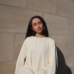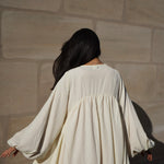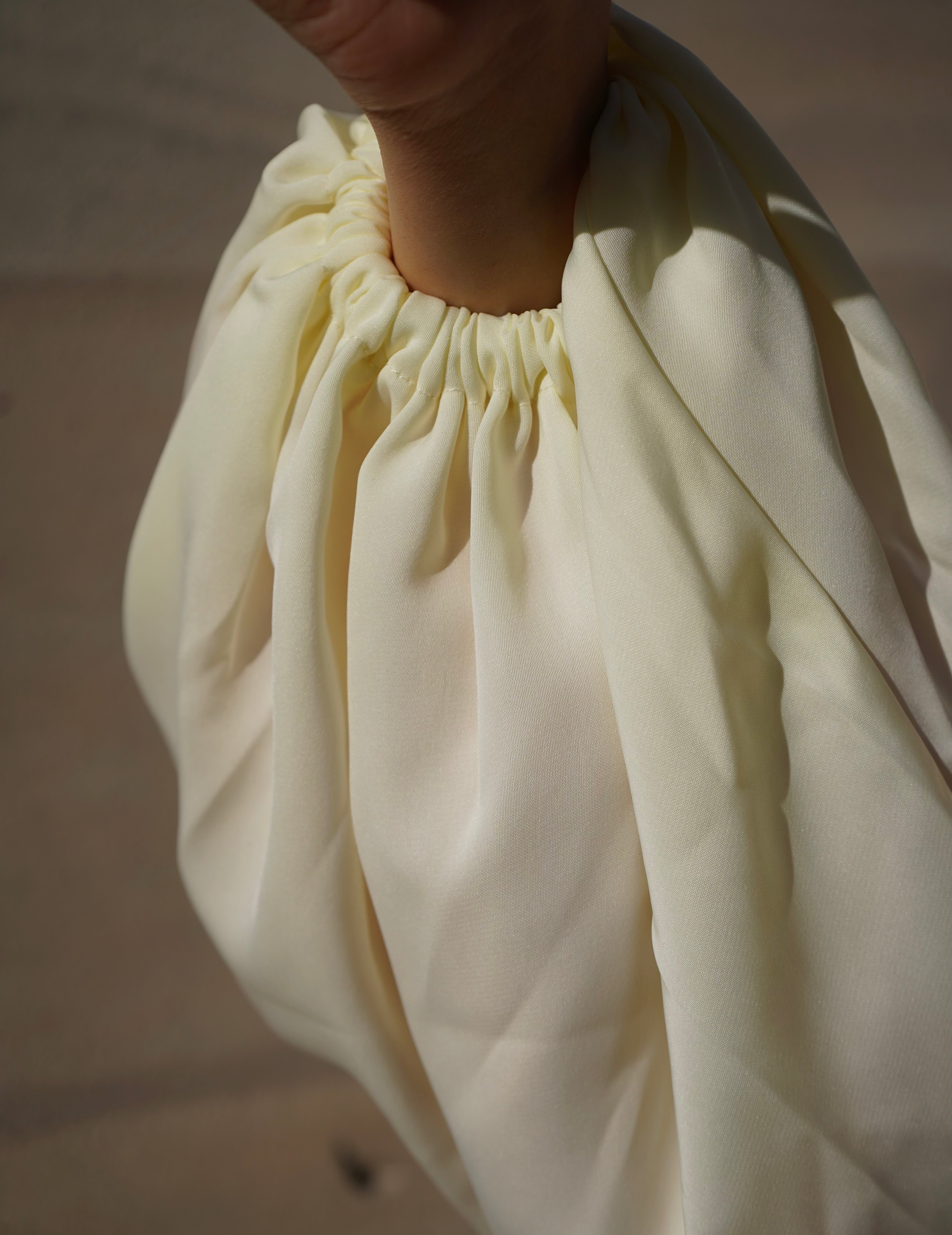Der Stoff ist hauchzart, extrem leicht und angenehm kühl, perfekt für warme Tage. Ihr sanftes Vanilla-Weiß erinnert an die schlichte Eleganz japanischer Ästhetik: klar, rein und zeitlos schön.